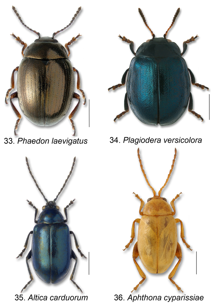 Body images in dorsal view: 33, Phaedon laevigatus (Duftschmid), 34, Plagiodera versicolora (Laicharting); 35, Altica carduorum (Guérin-Méneville); 36, Aphthona cyparissiae (Koch). Scale bar = 1mm.