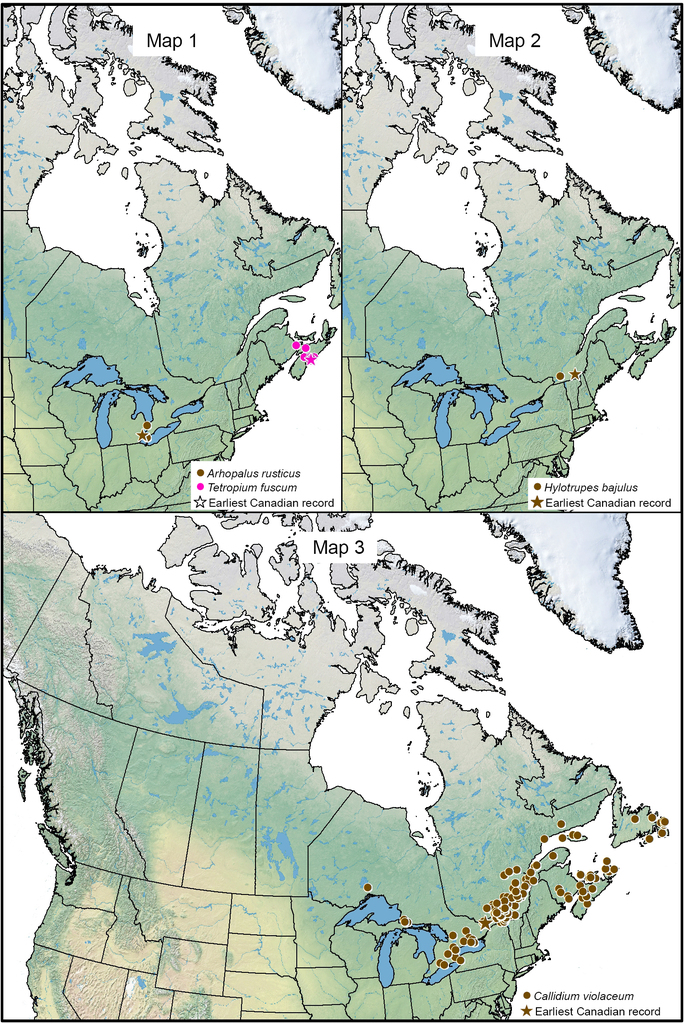 The nine species of non-native Cerambycidae include Oberea erythrocephala (Schrank), that was introduced as a weed biocontrol agent, and Hylotrupes bajulus (L.), which breeds only in seasoned wood and wood products. The remaining seven species breed in trees, three in conifers and four in hardwoods. Two of these, the brown spruce longhorned beetle, T. fuscum, and A. glabripennis, have been the focus of expensive pest management programs. While A. glabripennis was putatively eradicated from the country, T. fuscum is still frequently encountered in eastern Canada (