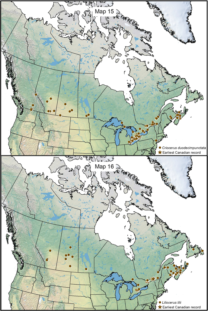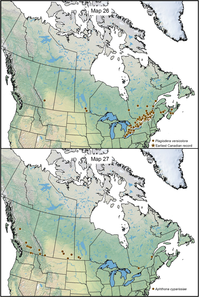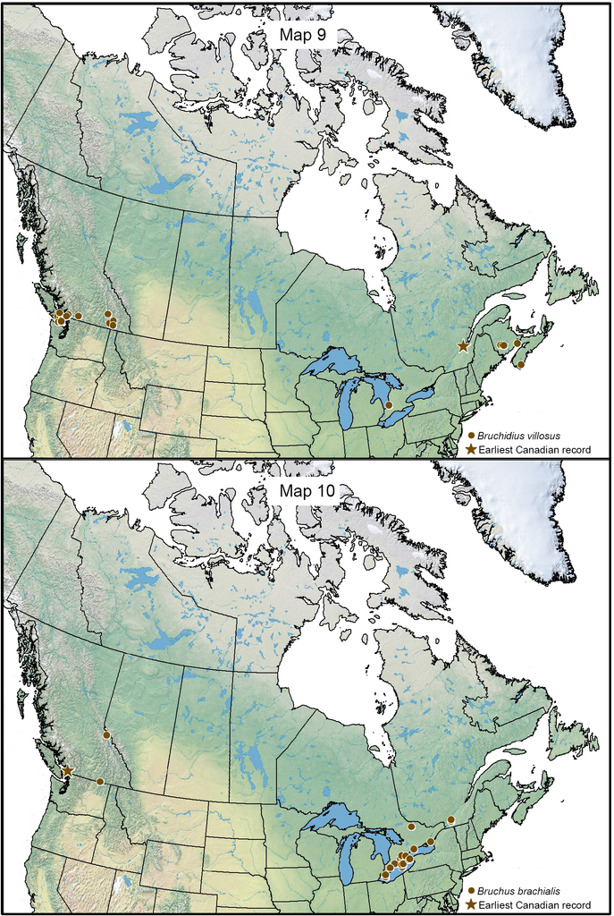 Information about status of biocontrol agents and locality records for established populations was provided by Rob Bourchier, Rose DeClerck-Floate, Vincent Hervet, and Peter Mason (AAFC, Lethbridge). We thank Claude Chantal (Quebec) for QC records of some Bruchinae; Claudia Copley (Royal British Columbia Museum), Vincent Hervet, Steve Marshall (University of Guelph), Cory Sheffield (Royal Saskatchewan Museum), Geoff Scudder (University of British Columbia), and Terry Wheeler (deceased, McGill University) for data from their collections; Serge Laplante (AAFC, Ottawa), Ron Neville (Canadian Food Inspection Agency), Jon Sweeney (Canadian Forest Service (CFS), Fredericton), and Doug Yanega (University of California – Riverside) for clarification of records of some Cerambycidae; Edward G. Riley (Texas A&M University) and Donald S. Chandler (University of New Hampshire) for clarification of some USA records for Chrysomelidae; and Timothy L. McCabe (New York State Museum) for providing the earliest Nearctic records of Tetrops praeustus. Specimens and locality data from recent collections of Bruchidius villosus in BC were kindly provided by Laura Hooper (District of Sooke). We thank Diane Paquet (CFS, Ste.-Foy) for formatting the first draft of this manuscript. The first author thanks Anthony Hopkin (CFS, Victoria), Elisabeth Gauthier (CFS, Ste.-Foy), and Jacinthe Leclerc (CFS, Ste-Foy), for supporting this study under the Forest Invasive Alien Species Project. Photographic credits for color images are to Klaus Bolte and some Chrysomelidae to Lech Borowiec. This project was funded by Natural Resources Canada, Canadian Forest Service.