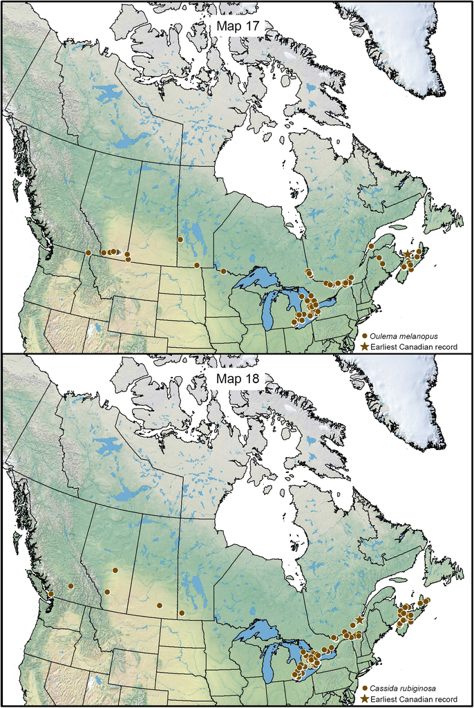 Results presented here indicate that non-native chrysomeloid beetles have been arriving in Canada since early arrival of Europeans. Continued discovery of new non-native species in Canada suggest that new introductions have continued into recent decades. It is perhaps too early to fully estimate the effectiveness of North American plant protection organizations’ efforts to reduce accidental establishments of new non-native Chrysomeloidea in Canada and neighbouring countries.